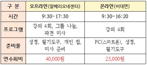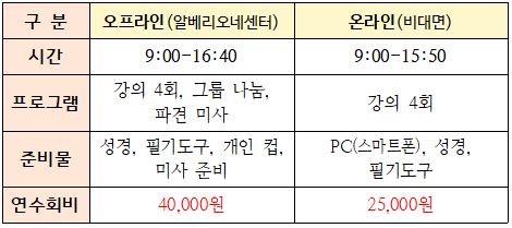 예수님의 사랑을 더욱 깊이 느끼도록 초대하는 예수성심 성월입니다. 한 학기 동안 공부하시면서 하느님 말씀에 맛 들여가는 기쁨 속에 지내셨기를 바라며, ‘연수회’ 안내를 드립니다. 연수회는 주제별로 진행되며, 학년에 상관없이 원하는 주제의 연수회를 신청하실 수 있습니다. 원하실 경우 두 차례 모두 신청하실 수도 있습니다.